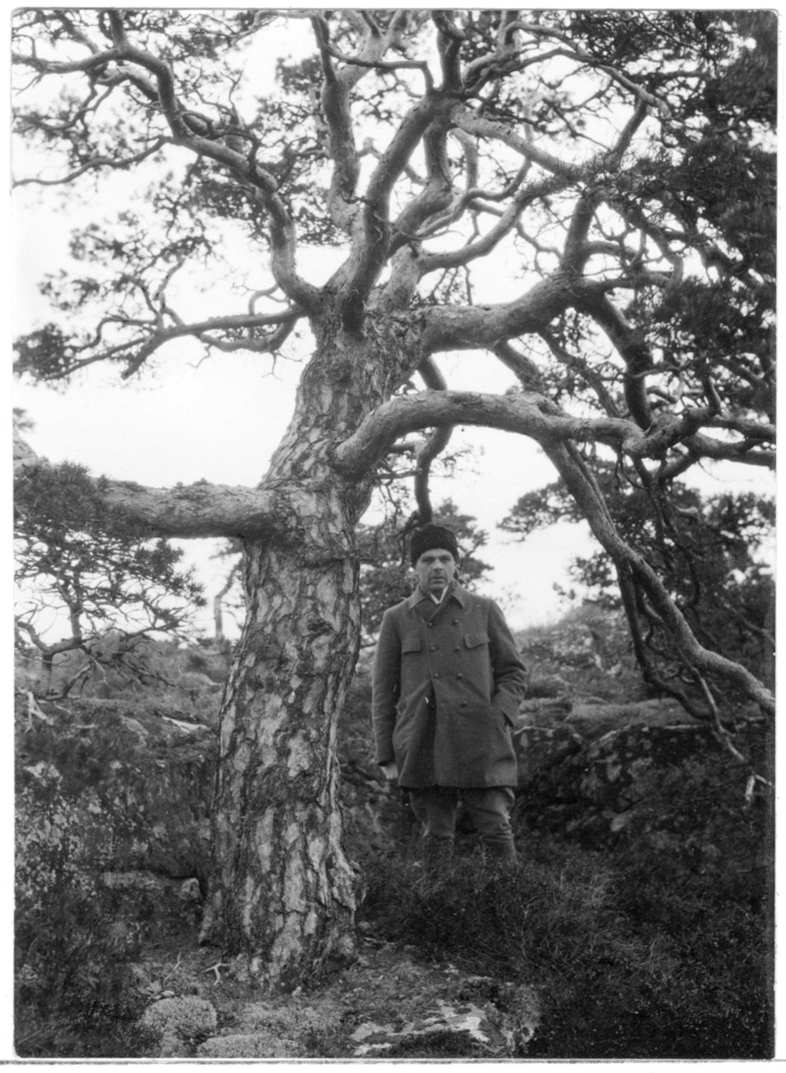 'Bildtext: ''Tall.'' 1 man står intill 1 väl förgrenad tall. :: :: Fotonr. 7046:119-185 indelade som ''Märkvärdiga träd i Göteborgs län och Bohus län''. Ingår i serie med fotonr. 7046:1-383, 7047:1-33 och 7048:1-67 med bilder från Länsjägmästare John Lindners bildarkiv.'