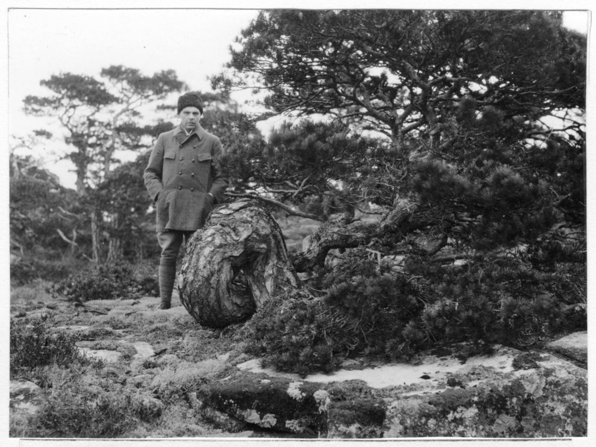 'Bildtext: ''Tall.'' 1 man står intill markkrypande tall. Kryptall. På lav- och risbevuxen berghäll. :: :: Fotonr. 7046:119-185 indelade som ''Märkvärdiga träd i Göteborgs län och Bohus län''. Ingår i serie med fotonr. 7046:1-383, 7047:1-33 och 7048:1-67 med bilder från Länsjägmästare John Lindners bildarkiv.'