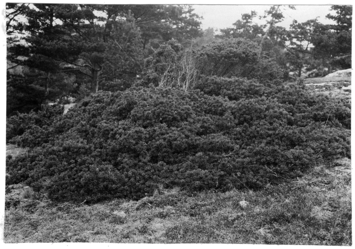 'Bildtext: ''Tall, krypande.'' Närbild på krypande tall. Kryptall på berghäll. :: :: Fotonr. 7046:119-185 indelade som ''Märkvärdiga träd i Göteborgs län och Bohus län''. Ingår i serie med fotonr. 7046:1-383, 7047:1-33 och 7048:1-67 med bilder från Länsjägmästare John Lindners bildarkiv.'