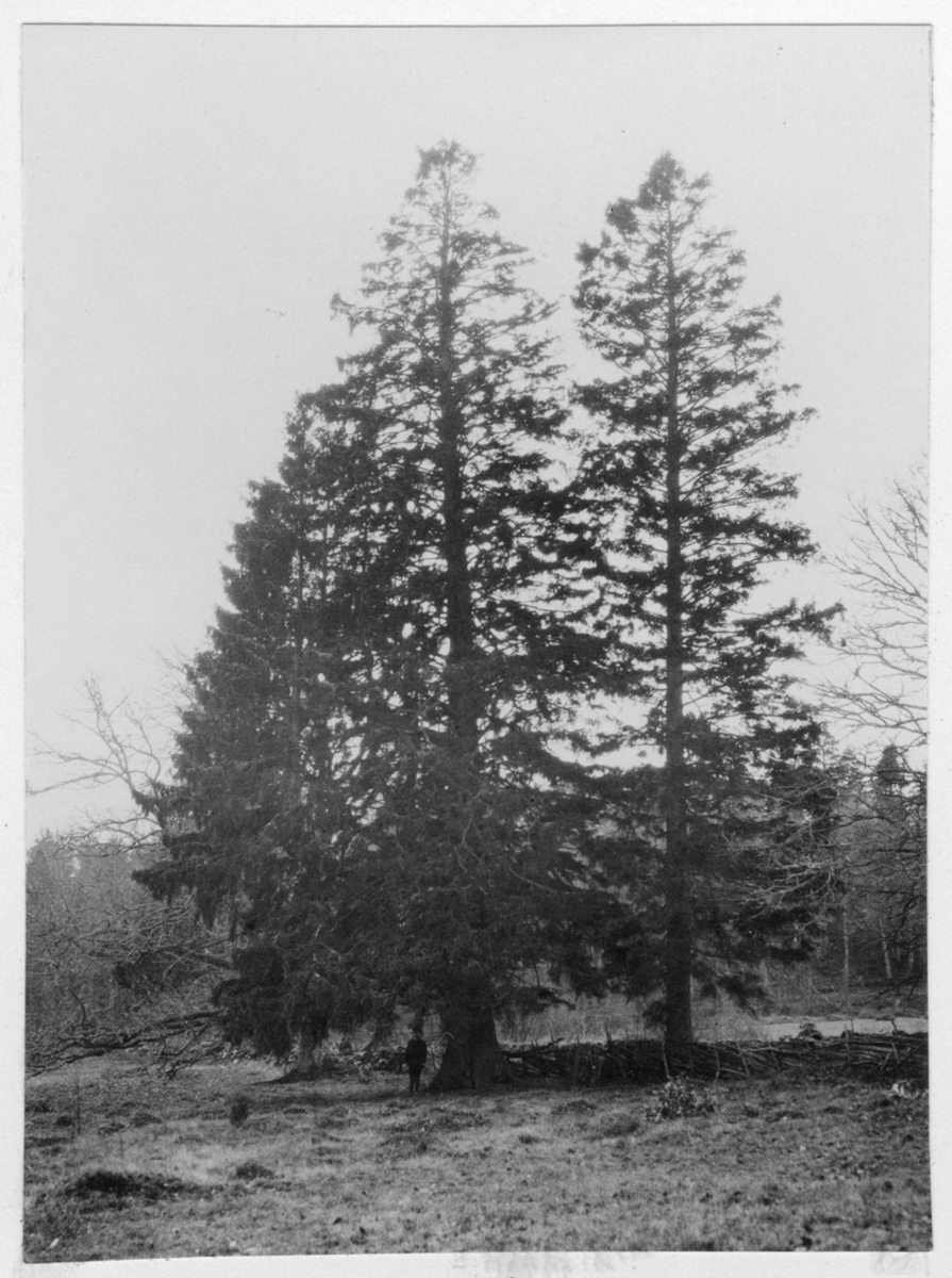 'Bildtext: ''Gran.'' 1 man står invid 2 granar varav den ena grov. Vid granarna trähägnad, även stenmur. Öppen mark. Se fotonr. 7046:140-142. :: :: Fotonr. 7046:119-185 indelade som ''Märkvärdiga träd i Göteborgs län och Bohus län''. Ingår i serie med fotonr. 7046:1-383, 7047:1-33 och 7048:1-67 med bilder från Länsjägmästare John Lindners bildarkiv.'