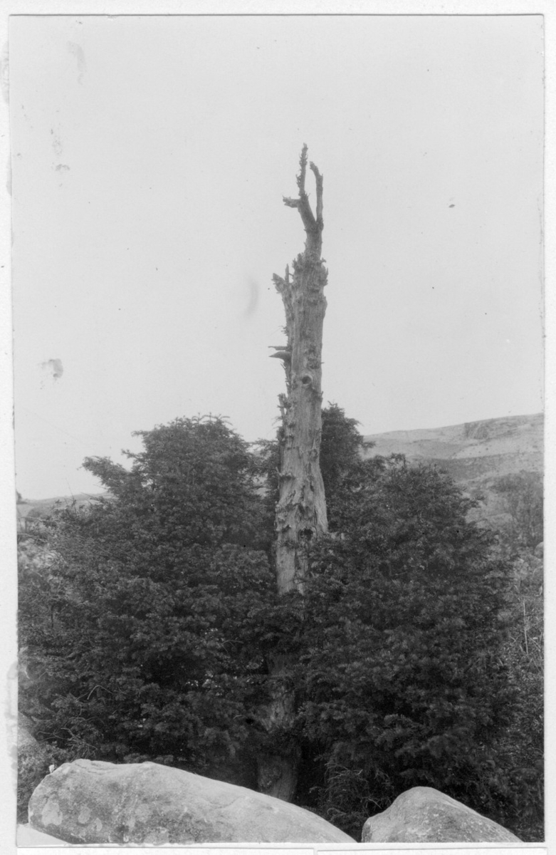 'Bildtext: ''Idgran, mycket gammal.'' Kal trädstam med idegransgrenar nertill. Se även fotonr. 7046:148. :: :: Fotonr. 7046:119-185 indelade som ''Märkvärdiga träd i Göteborgs län och Bohus län''. Ingår i serie med fotonr. 7046:1-383, 7047:1-33 och 7048:1-67 med bilder från Länsjägmästare John Lindners bildarkiv.'