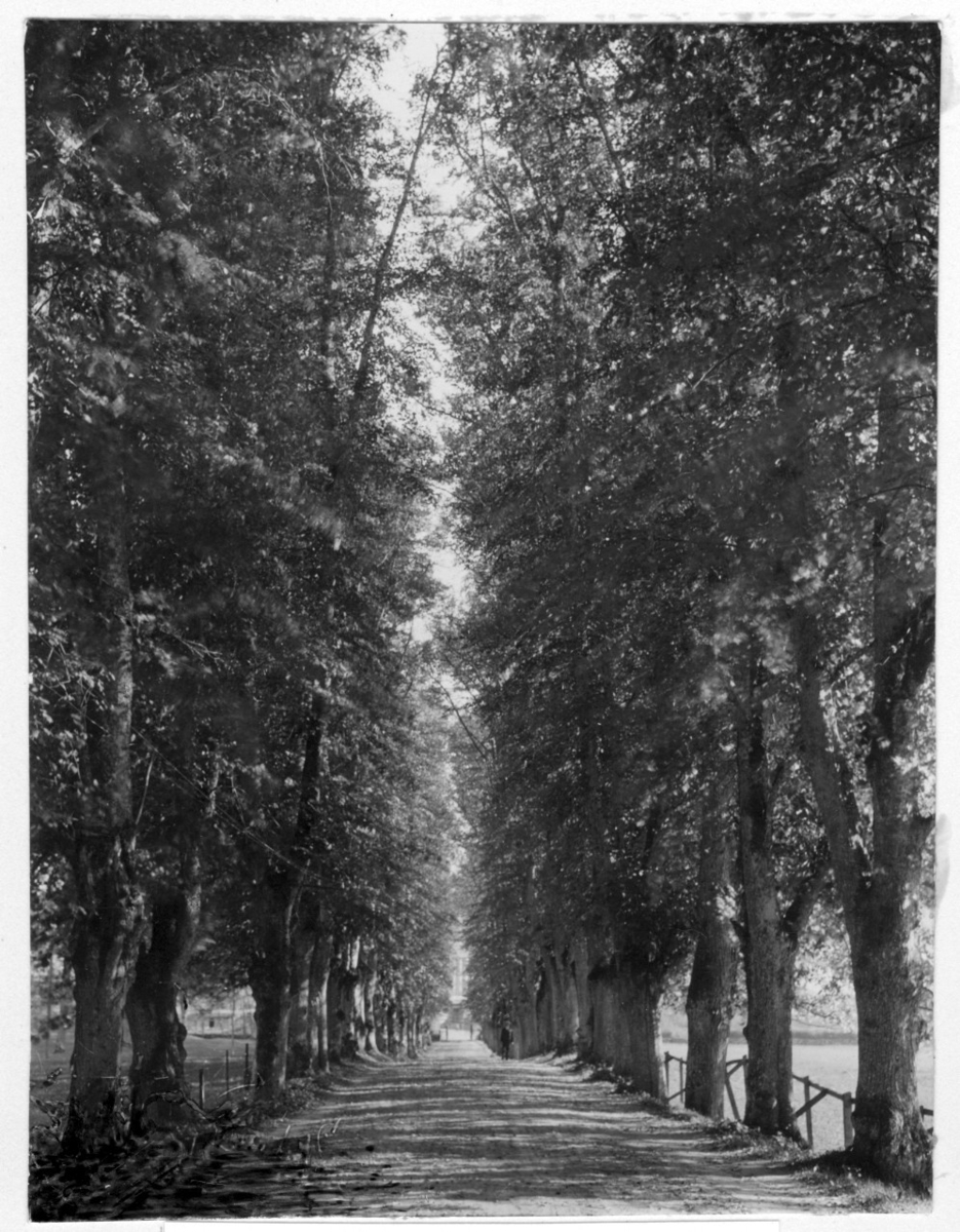 'Bildtext: ''Lindallé, planterad omkring 1750.'' 1 person gående på vägen i allén. Trähägnad på båda sidor om allén, mot öppen mark. :: :: Fotonr. 7046:119-185 indelade som ''Märkvärdiga träd i Göteborgs län och Bohus län''. Ingår i serie med fotonr. 7046:1-383, 7047:1-33 och 7048:1-67 med bilder från Länsjägmästare John Lindners bildarkiv.'