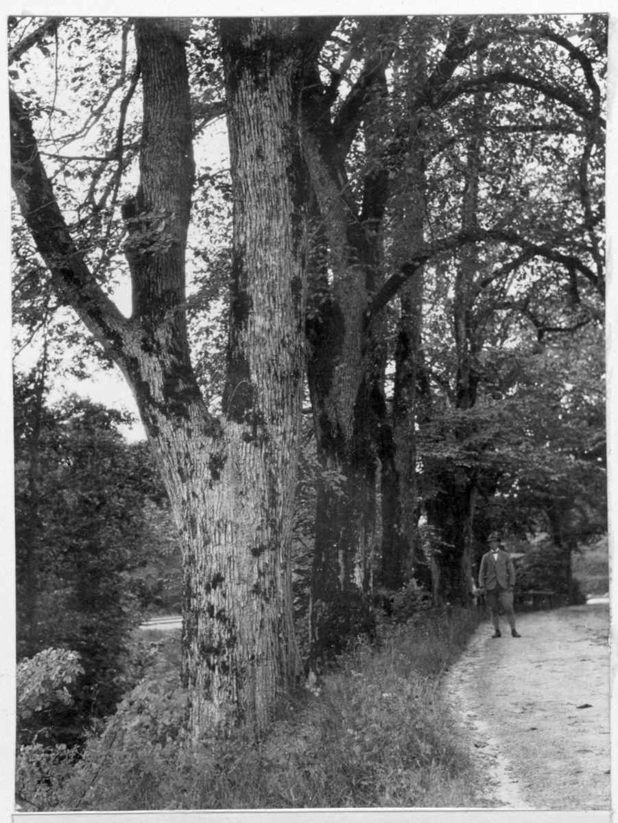 'Bildtext: ''Almar. 120 cm i diameter.'' 1 man stående på väg invid almar. Allé? :: :: Fotonr. 7046:119-185 indelade som ''Märkvärdiga träd i Göteborgs län och Bohus län''. Ingår i serie med fotonr. 7046:1-383, 7047:1-33 och 7048:1-67 med bilder från Länsjägmästare John Lindners bildarkiv.'