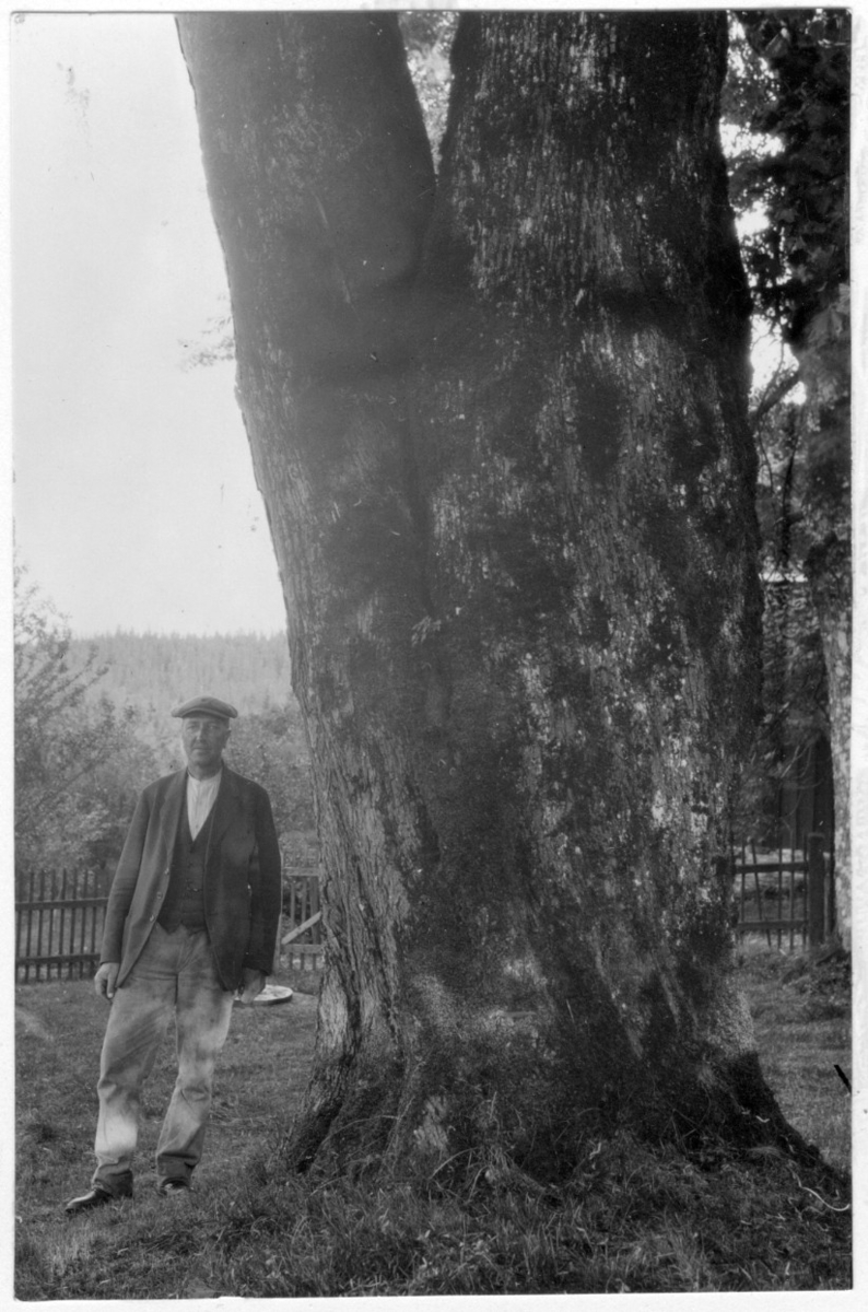 'Bildtext: ''Lönn, 150 år, 150 cm bred.'' Närbild på 1 man stående intill stammen på stor lönn. Trästaket i bakgrunden. Barrskog i fonden. :: :: Fotonr. 7046:119-185 indelade som ''Märkvärdiga träd i Göteborgs län och Bohus län''. Ingår i serie med fotonr. 7046:1-383, 7047:1-33 och 7048:1-67 med bilder från Länsjägmästare John Lindners bildarkiv.'
