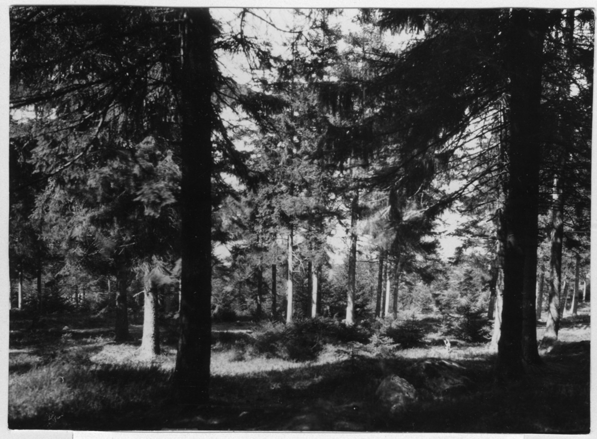 'Bildtext: ''Spontan granskog med självföryngring.'' Närbild på granar. :: :: Fotonr. 7046:234-275 indelade som ''Naturskogsbestånd i Göteborgs län och Bohus län''. Ingår i serie med fotonr. 7046:1-383, 7047:1-33 och 7048:1-67 med bilder från Länsjägmästare John Lindners bildarkiv.'