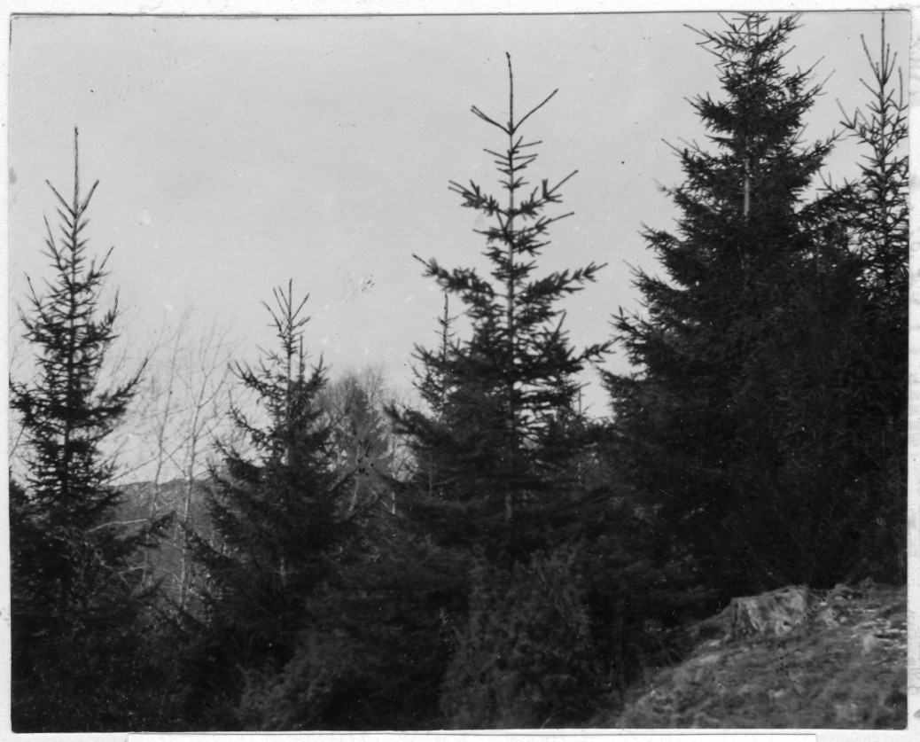 'Bildtext: ''Ung, självsådd gran vid spontana grangränsen.'' Närbild på unggranar. :: :: Fotonr. 7046:234-275 indelade som ''Naturskogsbestånd i Göteborgs län och Bohus län''. Ingår i serie med fotonr. 7046:1-383, 7047:1-33 och 7048:1-67 med bilder från Länsjägmästare John Lindners bildarkiv.'