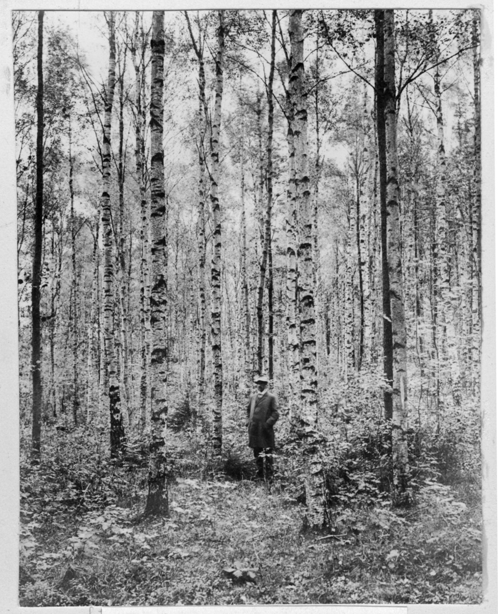 'Bildtext: ''Björkbestånd.'' 1 man stående bland björkar. Örtvegetation. :: :: Fotonr. 7046:234-275 indelade som ''Naturskogsbestånd i Göteborgs län och Bohus län''. Ingår i serie med fotonr. 7046:1-383, 7047:1-33 och 7048:1-67 med bilder från Länsjägmästare John Lindners bildarkiv.'