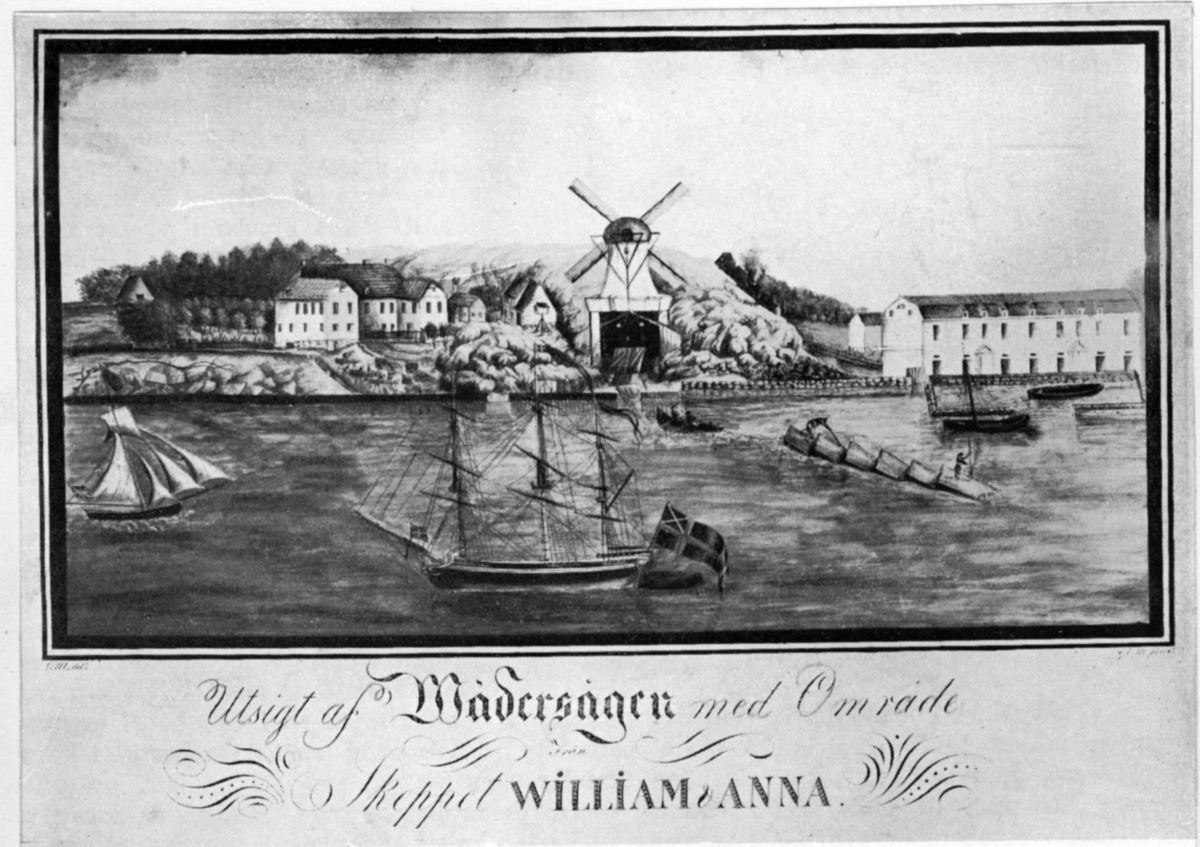 'Bildtext: ''Bild 372. Vädersågen i Majorna vid Göteborg omkring 1820.'' Vy med båtar, väderkvarn och hus. Träindustri. :: :: Fotonr. 7046:354-368 indelade som ''Virkesförädling, virkets användning.'' Ingår i serie med fotonr. 7046:1-383, 7047:1-33 och 7048:1-67 med bilder från Länsjägmästare John Lindners bildarkiv.'