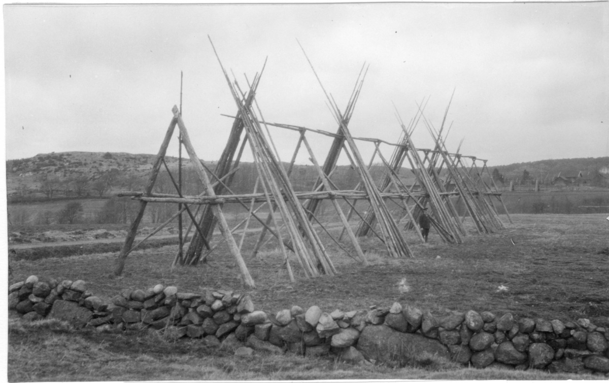 'Bildtext: ''Ärtkrake.'' Uppbyggd träställning på öppen gräsmark, stenmur i förgrunden. 1 man stående invid ställningen. I fonden hus. Stengärdesgård. :: :: Fotonr. 7046:354-368 indelade som ''Virkesförädling, virkets användning.'' Ingår i serie med fotonr. 7046:1-383, 7047:1-33 och 7048:1-67 med bilder från Länsjägmästare John Lindners bildarkiv.'