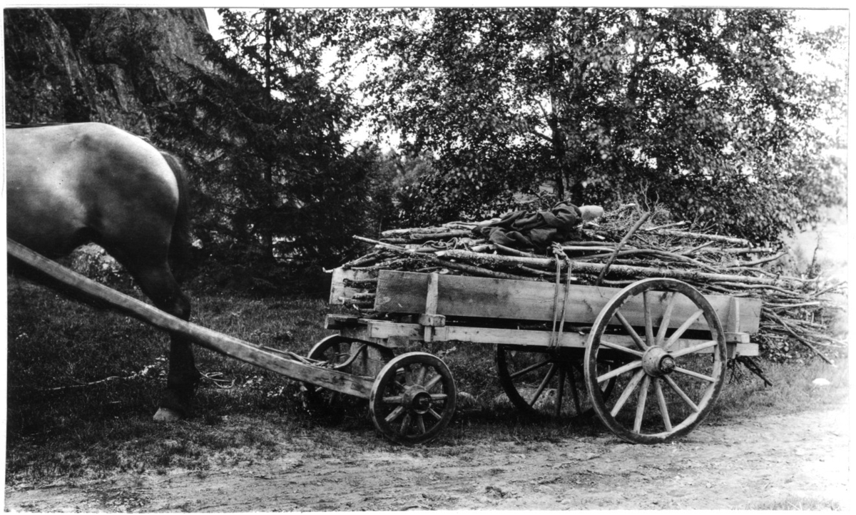 'Bildtext: ''Kolning i grop. Ett lass kolved (torra grangrenar).'' Närbild på vagnslass med grangrenar kopplad bakom häst. Små hjul fram och större bak till på vagnen. :: :: Fotonr. 7046:369-382 indelade som ''Kolning.'' Ingår i serie med fotonr. 7046:1-383, 7047:1-33 och 7048:1-67 med bilder från Länsjägmästare John Lindners bildarkiv.'