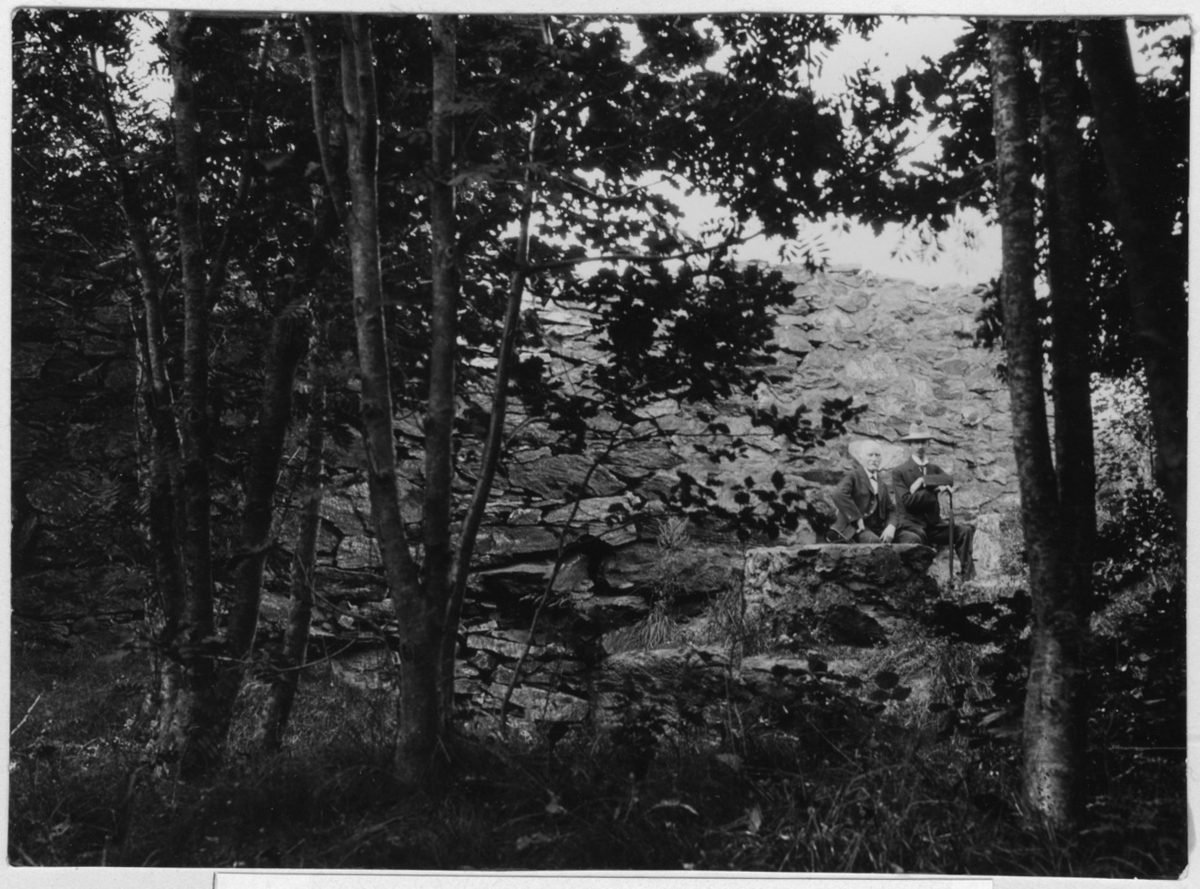 'Bildtext: ''Stenmur, uppförd för planteringens skydd mot blåsten.'' Närbild på 2 män framför hög stenmur, i förgrunden trädvegetation. :: :: Fotonr. 7047:2-23 indelad under rubriken ''Atmosfäriska skador på skogen, skogseld och släckning därav.'' Ingår i serie med fotonr. 7046:1-383, 7047:1-33 och 7048:1-67 med bilder från Länsjägmästare John Lindners bildarkiv.'