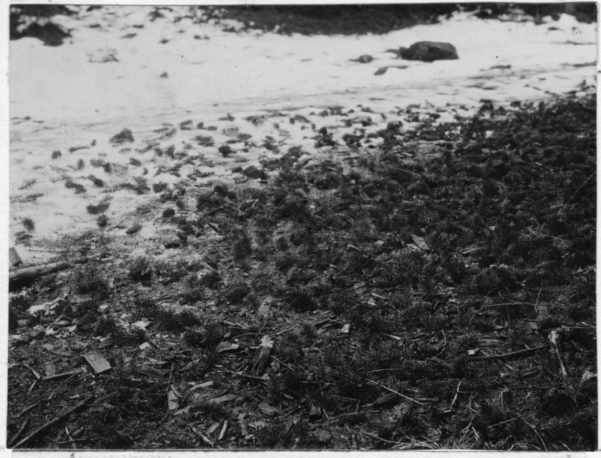'Bildtext: ''Av ekorrar avbitna granskott.'' Granskotten liggande på marken. :: :: Fotonr. 7048:1-26 indelad under rubriken ''Däggdjur, Människor''. Ingår i serie med fotonr. 7046:1-383, 7047:1-33 och 7048:1-67 med bilder från Länsjägmästare John Lindners bildarkiv.'