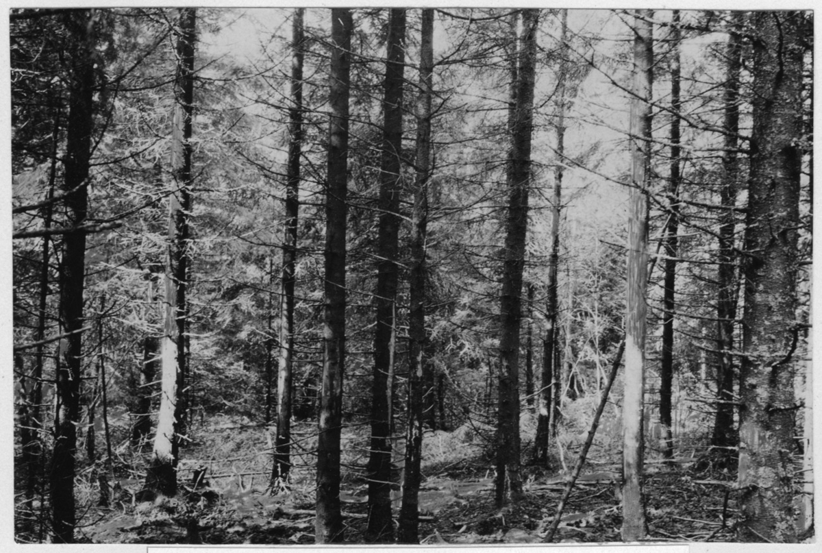 'Bildtext: ''Av hästar barkskalade granar.'' Närbild i granbestånd. :: :: Fotonr. 7048:1-26 indelad under rubriken ''Däggdjur, Människor''. Ingår i serie med fotonr. 7046:1-383, 7047:1-33 och 7048:1-67 med bilder från Länsjägmästare John Lindners bildarkiv.'