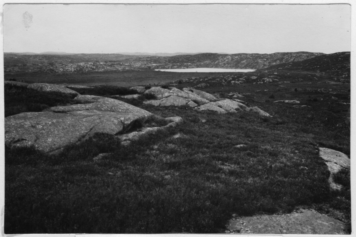 'Bildtext: ''Ljungmark.'' Vy över kala berghällar med ljungvegetation. :: :: Fotonr. 7048:1-26 indelad under rubriken ''Däggdjur, Människor''. Ingår i serie med fotonr. 7046:1-383, 7047:1-33 och 7048:1-67 med bilder från Länsjägmästare John Lindners bildarkiv.'