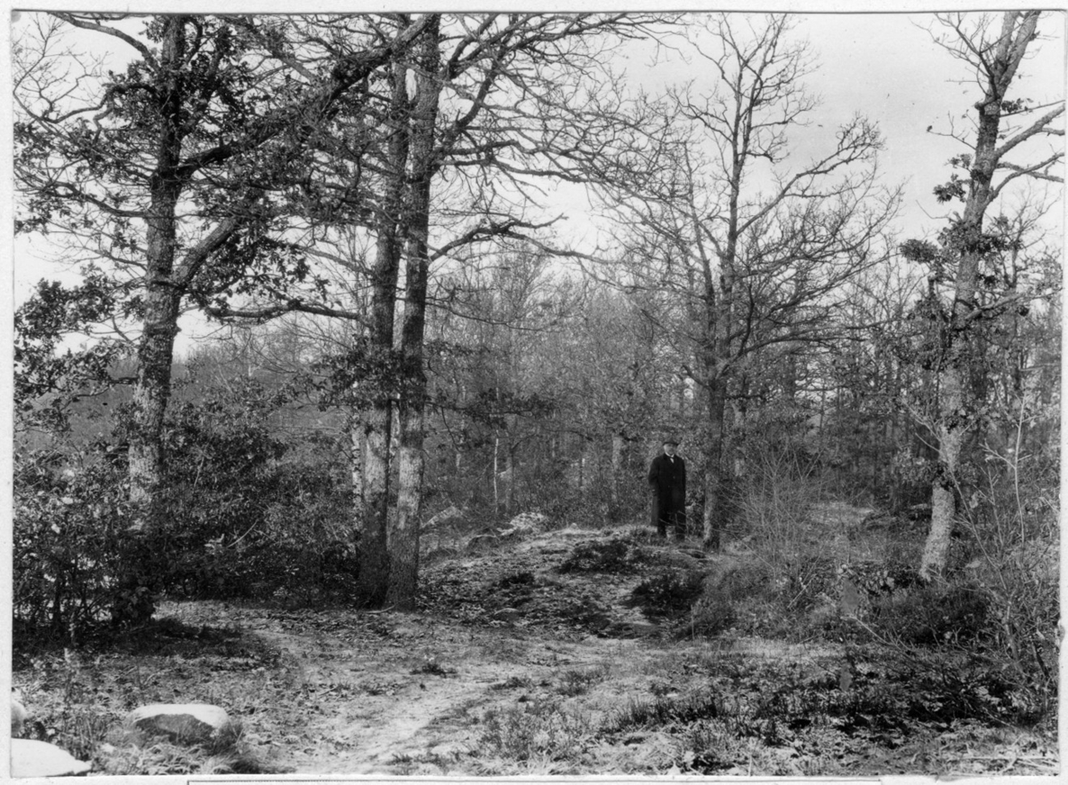 'Bildtext: ''Gammaldags hagmark, vanskött, dålig skog och mindervärdigt bete.'' Vy med 1 man stående vid lövträd. Lövträdsvegetation och viss buskvegetation. :: :: Fotonr. 7048:1-26 indelad under rubriken ''Däggdjur, Människor''. Ingår i serie med fotonr. 7046:1-383, 7047:1-33 och 7048:1-67 med bilder från Länsjägmästare John Lindners bildarkiv.'