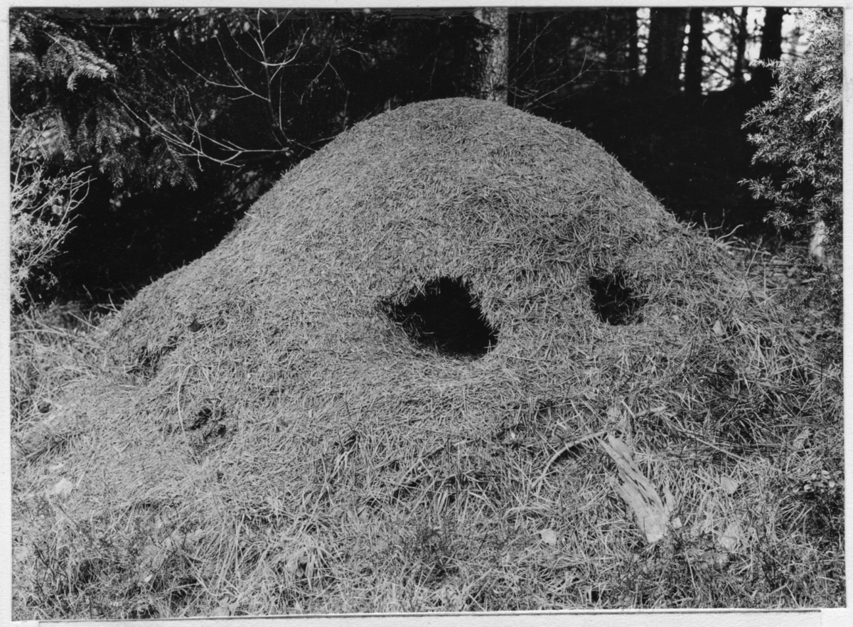 'Bildtext: ''Myrstack med hål av gröngöling.'' Närbild på myrstacken med barrträd intill. :: :: Fotonr. 7048:27-37 indelad under rubriken ''Naturstudier''. Ingår i serie med fotonr. 7046:1-383, 7047:1-33 och 7048:1-67 med bilder från Länsjägmästare John Lindners bildarkiv.'