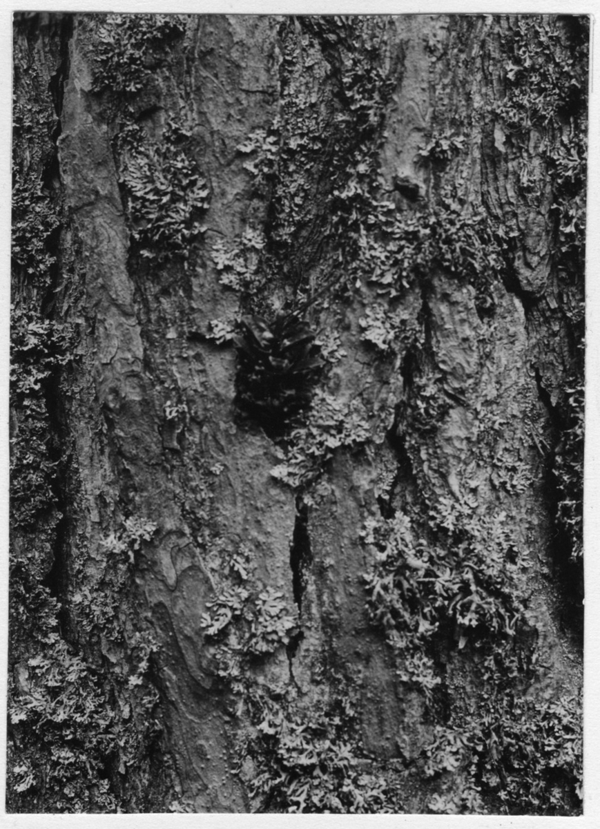 'Bildtext: ''Av större hackspett sönderhackad tallkotte.'' Närbild på tallkotte fastsittande i barken på tallstammen. :: :: Fotonr. 7048:27-37 indelad under rubriken ''Naturstudier''. Ingår i serie med fotonr. 7046:1-383, 7047:1-33 och 7048:1-67 med bilder från Länsjägmästare John Lindners bildarkiv.'