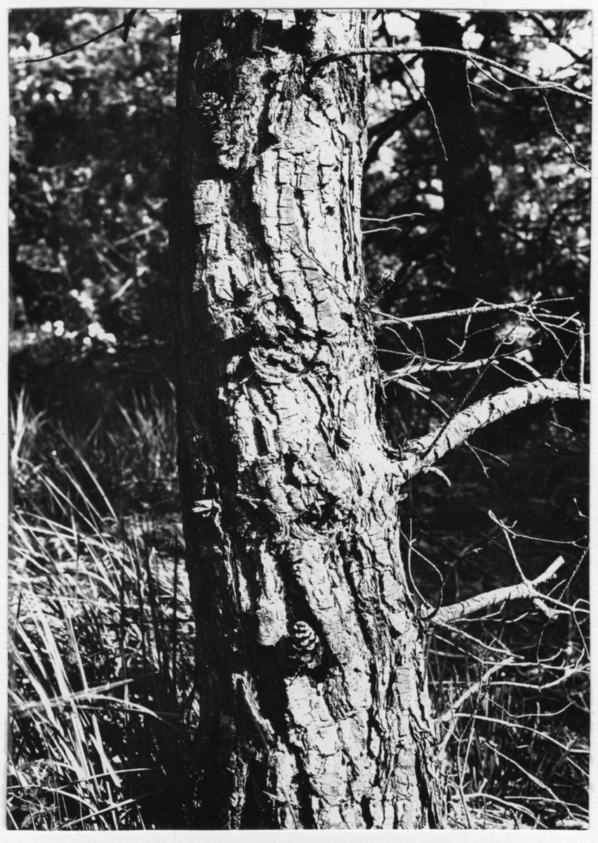 'Bildtext: ''Av större hackspett (Pims major?) sönderhackade tallkottar.'' Närbild på tallstam med tallkottar fastsittande i barken. :: :: Fotonr. 7048:27-37 indelad under rubriken ''Naturstudier''. Ingår i serie med fotonr. 7046:1-383, 7047:1-33 och 7048:1-67 med bilder från Länsjägmästare John Lindners bildarkiv.'