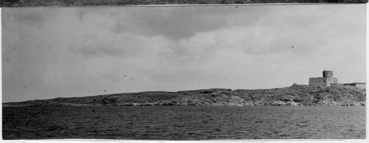 'Bildtext: ''Marstrands fästning.'' Vy med kal berghäll i havet med fästning i sten. :: :: Fotonr. 7048:42-46 indelad under rubriken ''Skogens historia i Göteborgs och Bohus län under historisk tid''. Ingår i serie med fotonr. 7046:1-383, 7047:1-33 och 7048:1-67 med bilder från Länsjägmästare John Lindners bildarkiv.'