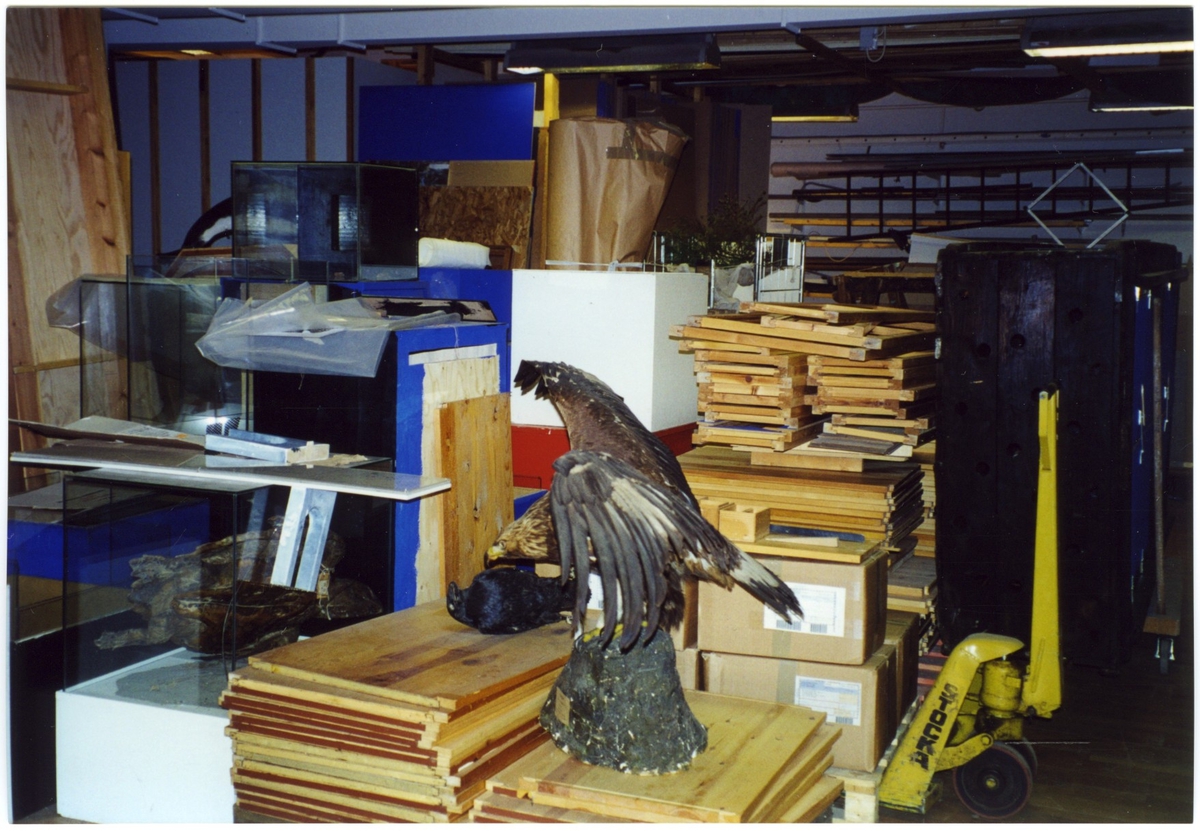 'Bildtext: ''Monteringshallens tillstånd.'' Utrymme med diverse material och föremål. Högar av träskivor och i förgrunden monterad fågel. Truck synlig. :: :: Ingår i serie med fotonr. 7049:1-15 ''Fotodokumentation av mögelsanering och av lokaler i källaren.'''