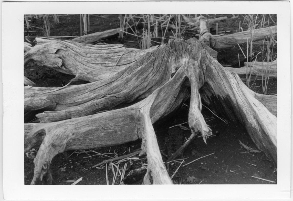 'Närbild på 5000-årig, subfossil tallstubbe. En stubbe finns monterad på väggen på entréplan på Göteborgs Naturhistoriska museum. :: :: Ingår i serie med fotonr. 7051:1-8, se även fotonr 4709 - 4714.'