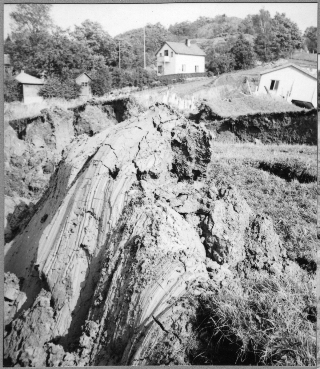 'Bildtext: ''En kil av lera, som pressats upp genom en spricka. Norra delen av Surteskredet.'' I förgrunden lermassa påverkad av skredet, ca 5 hus på avstånd som delvis glidit. :: :: Ingår i serie med fotonr. 7052:1-19 med bilder bl.a. från Surteskredet.'