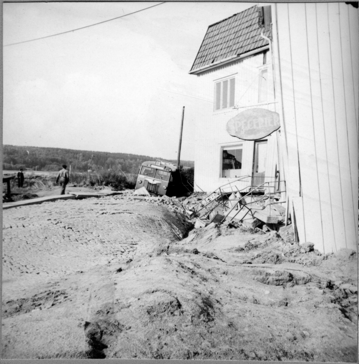 'Bildtext: ''Del av huvudvägen genom Surte med en fastkilad buss.'' Kullerstenslags väg intill hus med skylt ''Specerier'' där trappan till huset glidit ner av skredets påverkan. På vägen buss. :: :: Ingår i serie med fotonr. 7052:1-19 med bilder bl.a. från Surteskredet.'