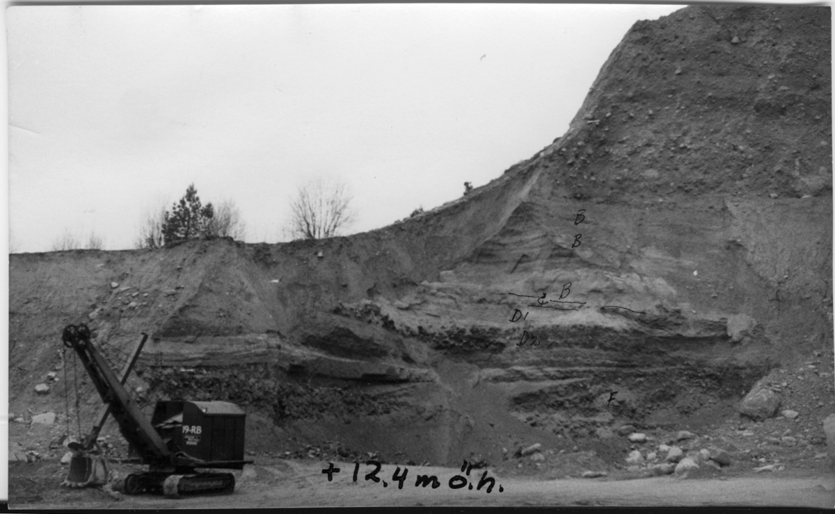 'Vägg i grustaget med grusavlagringens lagerföljd synliga. I förgrunden maskin, grävskopa. Bildtext: ''Dösebacka, 12,4 meter över havet''. Markeringar på bilden. För mer information se fotonr. 7058:25. :: :: Ingår i serie med fotonr. 7058:1-32.'