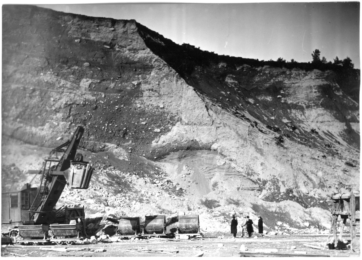'Vy av del av grustaget med maskin, grävmaskin i arbete. Liten grupp, ca 4 personer, stående nedanför vägg i grustaget. :: :: Ingår i serie med fotonr. 7060:1-20 med bilder från Dösebacka- och/eller Ellesbomoränen.'