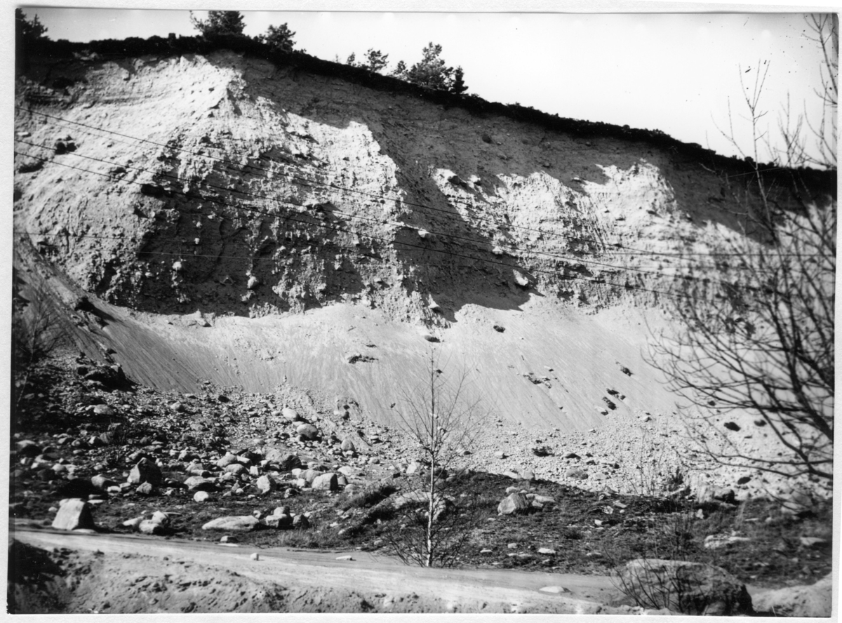 'Vy över en vägg i grustaget. Elledningar hängande i luften. :: :: Ingår i serie med fotonr. 7060:1-20 med bilder från Dösebacka- och/eller Ellesbomoränen.'