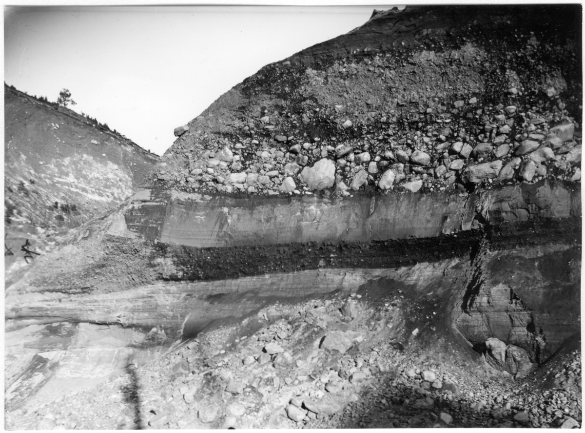 'Närbild på vägg i grustaget med grusavlagringens lagerföljd tydligt synliga med moränen. :: :: Ingår i serie med fotonr. 7060:1-20 med bilder från Dösebacka- och/eller Ellesbomoränen.'