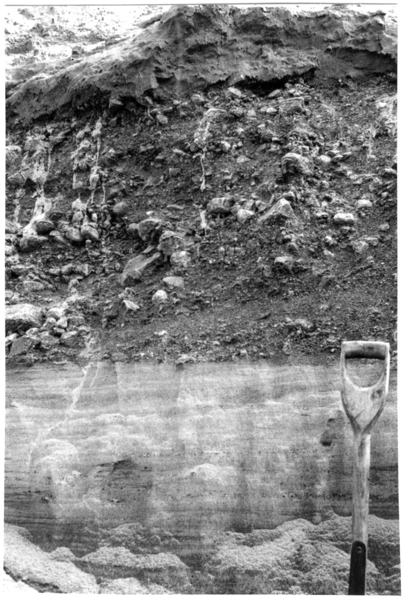 'Närbild på 2 lager i grusavlagringen, morän och sand. Spadhandtag synligt.Se även fotonr. 7060:17 för samma motiv. :: :: Ingår i serie med fotonr. 7060:1-20 med bilder från Dösebacka- och/eller Ellesbomoränen.'