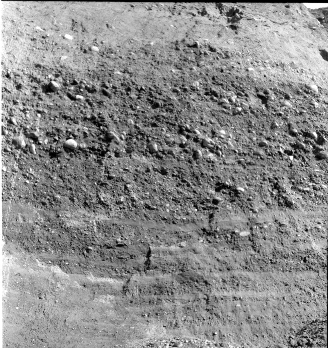 'Närbild på lager i grusavlagringen. :: :: Ingår i serie med fotonr. 7060:1-20 med bilder från Dösebacka- och/eller Ellesbomoränen.'
