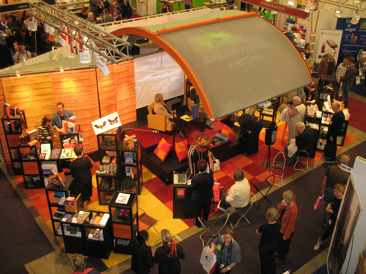 Västarvets monter under Bokmässan 2007-09-27 till 2007-09-30 på Svenska mässan, Göteborg. Göteborgs Naturhistoriska Museums del av montern prydd med fjärilsbilder. Personal från Västarvet samt besökare i och omkring monterna. Projektorskärm.