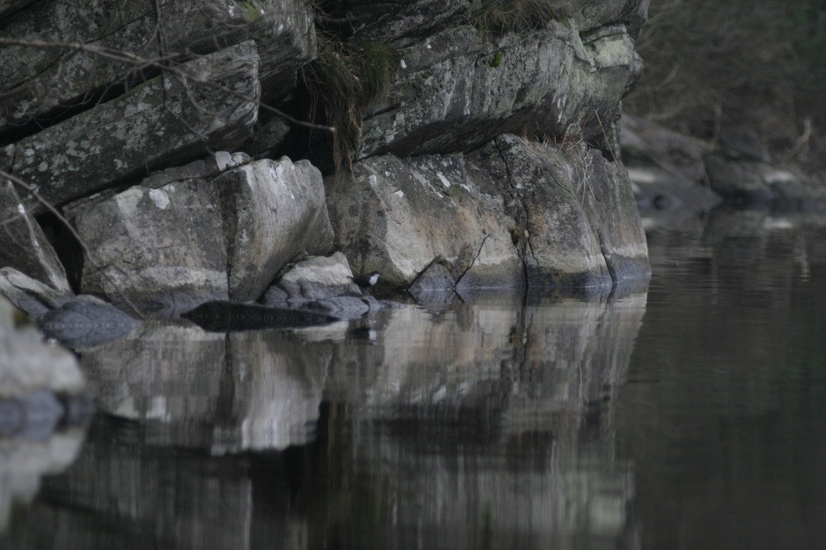 'Vy med bergvägg ner vid vattendrag, strömstare sittande på stenblock i vattnet. :: :: Ingår i serie med fotonr. 7073:1-3.'