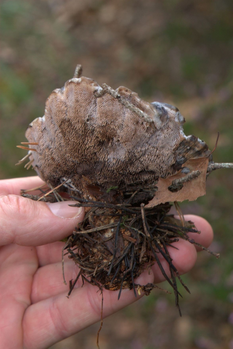 'Bilder från Rambomosse, tagna under arbete med inventering av hasselsnok vid Rambomosse och Hålsjöområdet: :: :: Närbild på undersidan av blå taggsvamp. :: :: Ingår i serie med fotonr. 7075:1-42. Bilderna tagna i samband med arbetet att skriva en rapport om ''Hasselsnoken vid Rambo mosse''. Rapportens författare, Leif Lithander, Anders Nilsson och Göran Nilson, Göteborgs Naturhistoriska Museum 2007-11-27.'