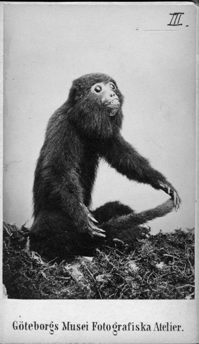 'Monterad svart bölapa. :: Text till bilden: ''Svarta bölapan förekommer i Brasilen. Af namnet erfar man redan, att hennes ljud ej är behagligt för våra öron. Hennes struphuvud har en egen bygnad, hvadan hennes ljud eger en ofantlig styrka, som dånar vidt öfver nejden, då hon från någon trädtopp i skogen, i solljuset, som hon högt älskar, gifver luft åt sina känslor. Bölapan är trög, klättrar långsamt men säkert och lever af frukter och insekter. Hon blir lätt tam, men är olidlig både för sitt ljud och sin efterhängsenhet. Hennes kött ätes allmänt i Brasilien. /August Wilhelm Malm år 1866. :: :: Serie med fotonr. 7079:1-37. Fotografierna är monterade i en liten bok, inbunden, med titel ''Fotografier öfer Däggdjur och foglar. Texter av A. W (1866). Malm. Boken återfinns i Göteborgs Naturhistoriska Museums bibliotekssamling under ''Äldretryck''. På baksidan av varje foto finns en text om arten. :: :: Se även fotonr. 5693:1-4.'