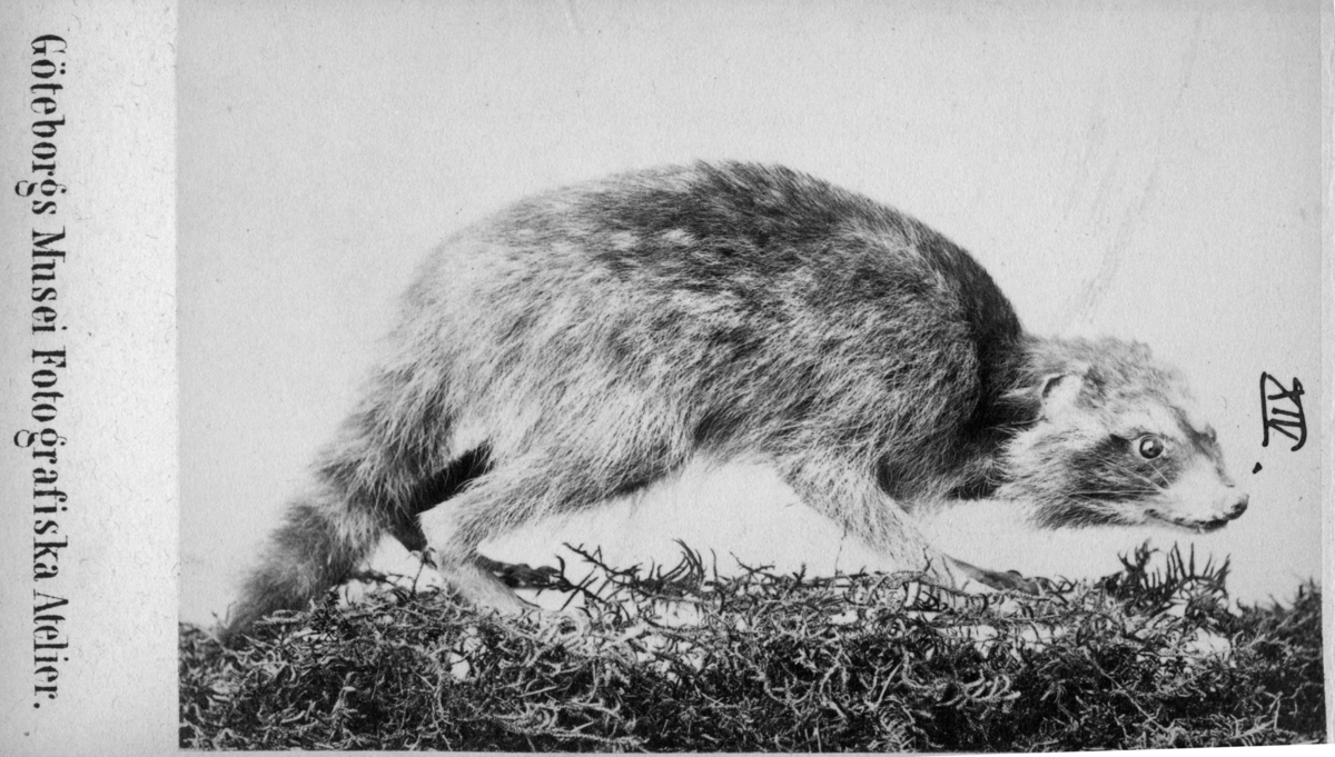 'Monterad tvättbjörn. :: :: Text till bilden: ''Tvättbjörn eller Schuppen träffas i Nordamerika till 56 graders latitud. Han lefver af frukt, fogel, ägg m.m. Egendomligt nog sköljer och gnider han emellen framfötterna allt, innan det förtäres, hvadan namnet ej är öfverdrivet. Hans skinn lemnar ett förträffligt pelsverk och förekommer under namn af Schuppskinn. Han tycks trifvas även i vårt klimat, hvilket han man redan kan sluta till af det , hvaraf han är van i sitt hemland, ty för några år sedan utkom på hösten ett exemplar från Göteborgs trädgårdsförening och sköts i januari uti ett träd i Slottsskogen. Denna schupp var då ganska fet och tycktes hafva trifts bra och väl vetet att försörja sig med hvad våra trakter hafva att erbjuda.'' /August Wilhelm Malm år 1866. :: :: Serie med fotonr. 7079:1-37. Fotografierna är monterade i en liten bok, inbunden, med titel ''Fotografier öfer Däggdjur och foglar. Texter av A. W (1866). Malm. Boken återfinns i Göteborgs Naturhistoriska Museums bibliotekssamling under ''Äldretryck''. På baksidan av varje foto finns en text om arten. :: :: Se även fotonr. 5693:1-4.'
