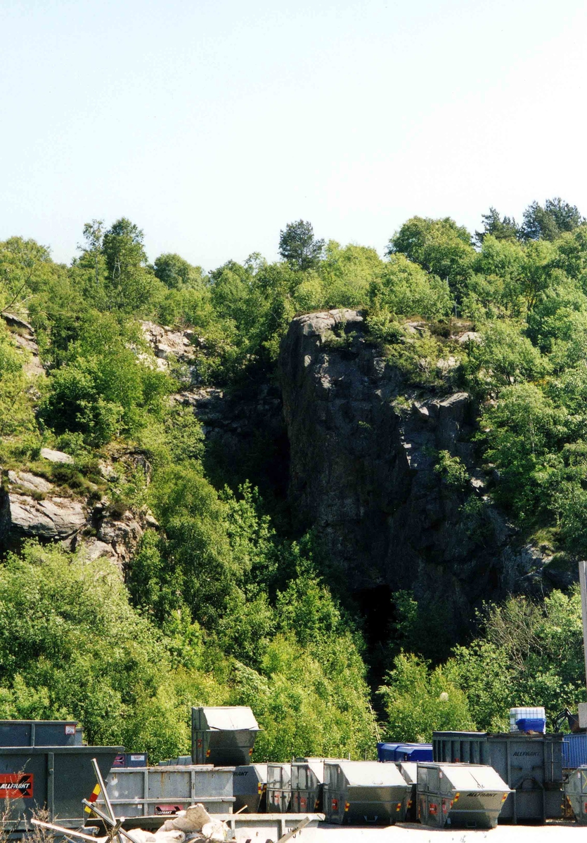 'Personal från Göteborgs Naturhistoriska Museum på utflykt till Högsbo pegmatitbrott: :: :: Vy upp mot pegmatitbrottet. Nedanför ett antal containrar. :: :: Ingår i serie med fotonr. 7081:1-5.'