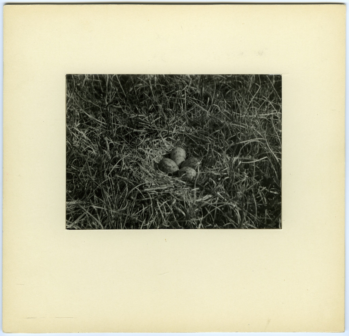 'Bildtext: ''Bo av storspov.'' :: Närbild på bo av storspov med 4 ägg, fläckiga. :: :: Ingår i serie med fotonr. 7083:1-55.'