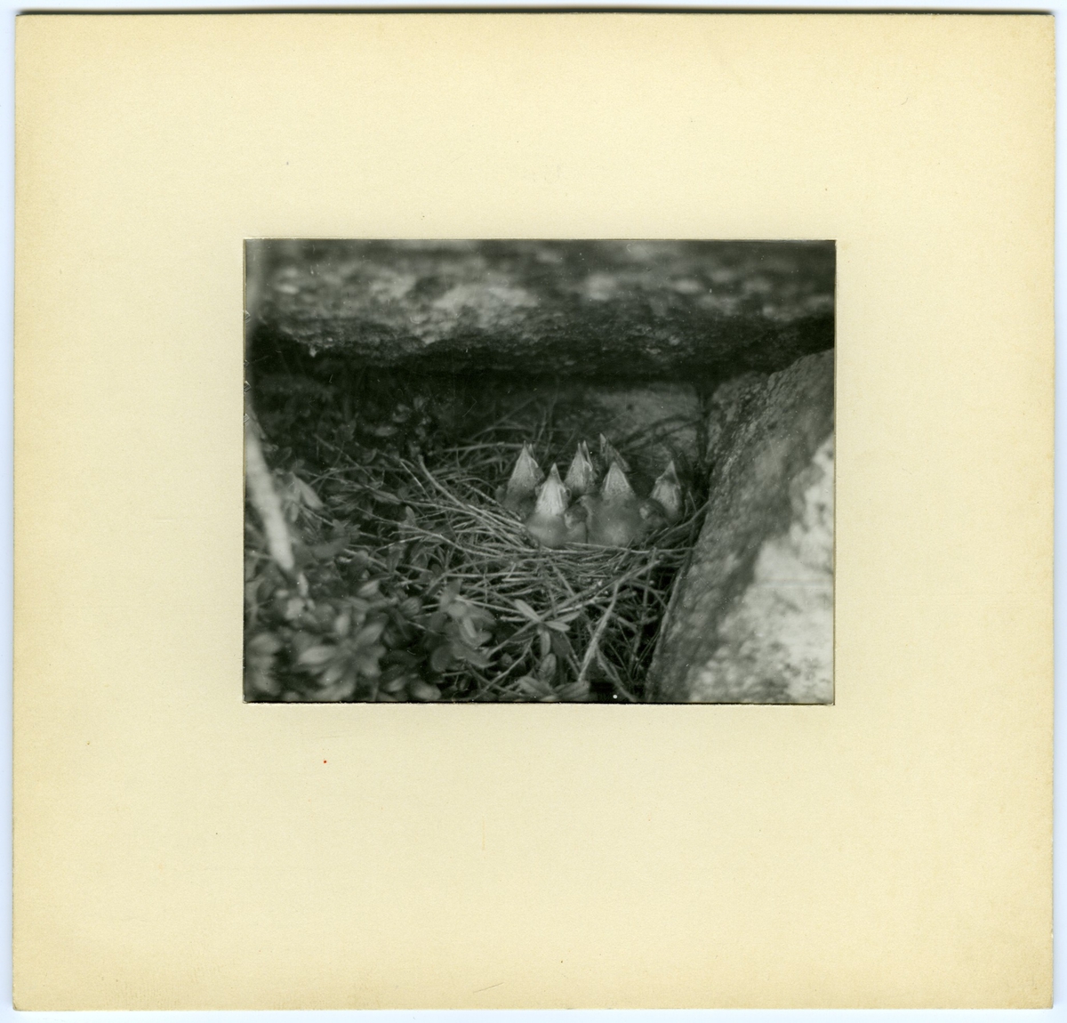'Bildtext: ''Nötskrikans ungar är snart klara att lämna boet.'' :: Närbild på ungarna, ca 6 st, i boet. :: :: Ingår i serie med fotonr. 7083:1-55.'