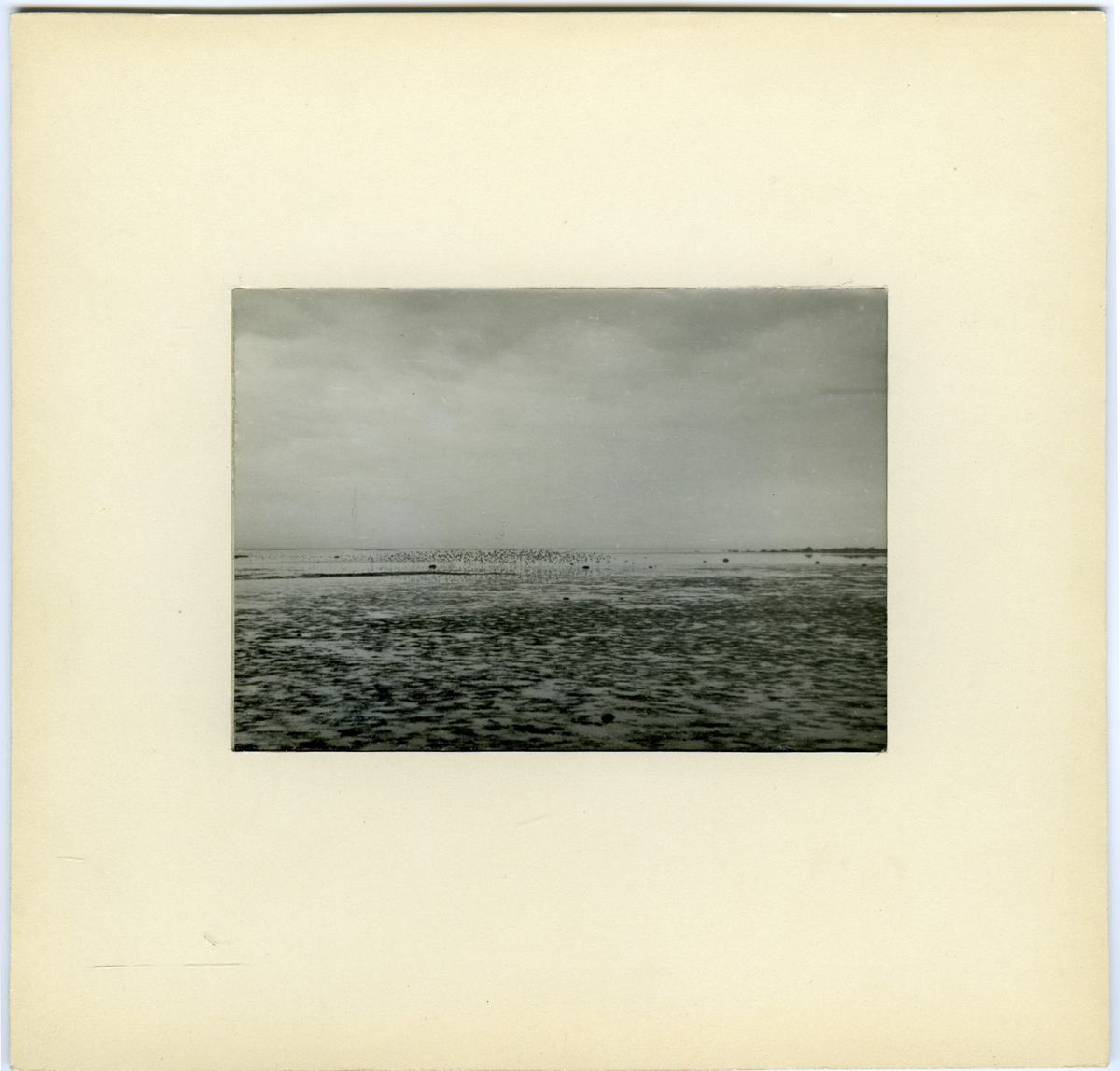 'Bildtext: ''Småvadarflock på några hundra ex, mest kärrsnäppor.'' :: Vy med fågelflock på avstånd ute i vattnet, havet. :: :: Ingår i serie med fotonr. 7083:1-55.'