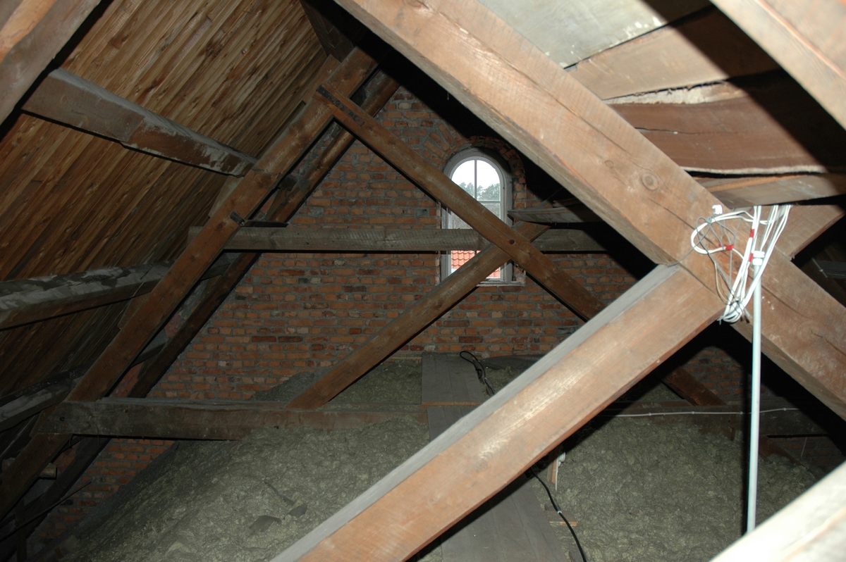 'Loftet ovanför glasvinden. :: :: Fotonr. 7095 består av en bildserie som dokumenterar diverse utrymmen i byggnaden så som kontor, arbetsplatser, arbetsrum, magasin m.m. Bilder tagna före och efter olika ombyggnationer bl.a.'