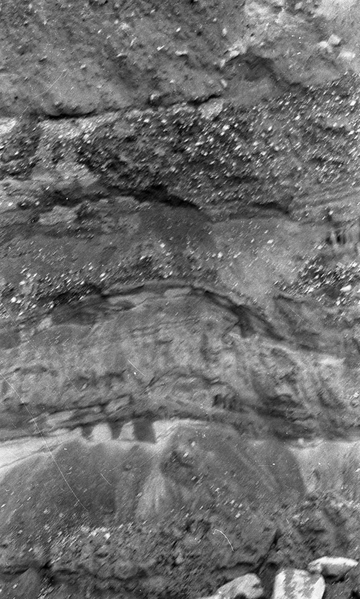 'Närbild, detaljbild på vägg i sandtaget, moränen. :: :: Ingår i serie med fotonr. 7096:1-30 med bilder från Dösebacka sandtag med omgivning.'