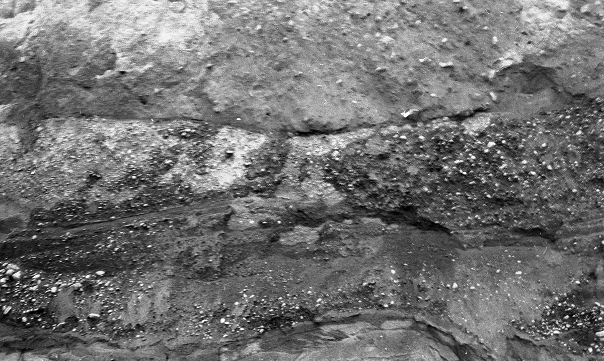 'Närbild på vägg i sandtaget, moränens lager synlig. :: :: Ingår i serie med fotonr. 7096:1-30 med bilder från Dösebacka sandtag med omgivning.'