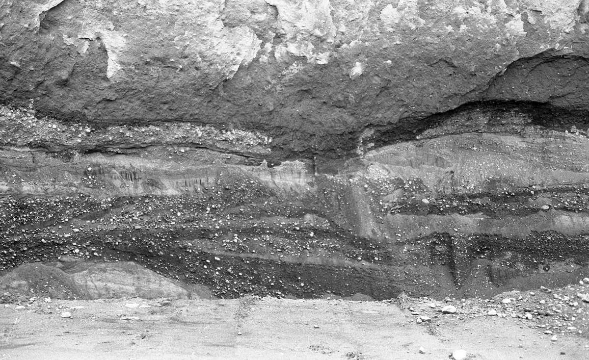 'Närbild på vägg i sandtaget, moränens lager synlig. :: :: Ingår i serie med fotonr. 7096:1-30 med bilder från Dösebacka sandtag med omgivning.'