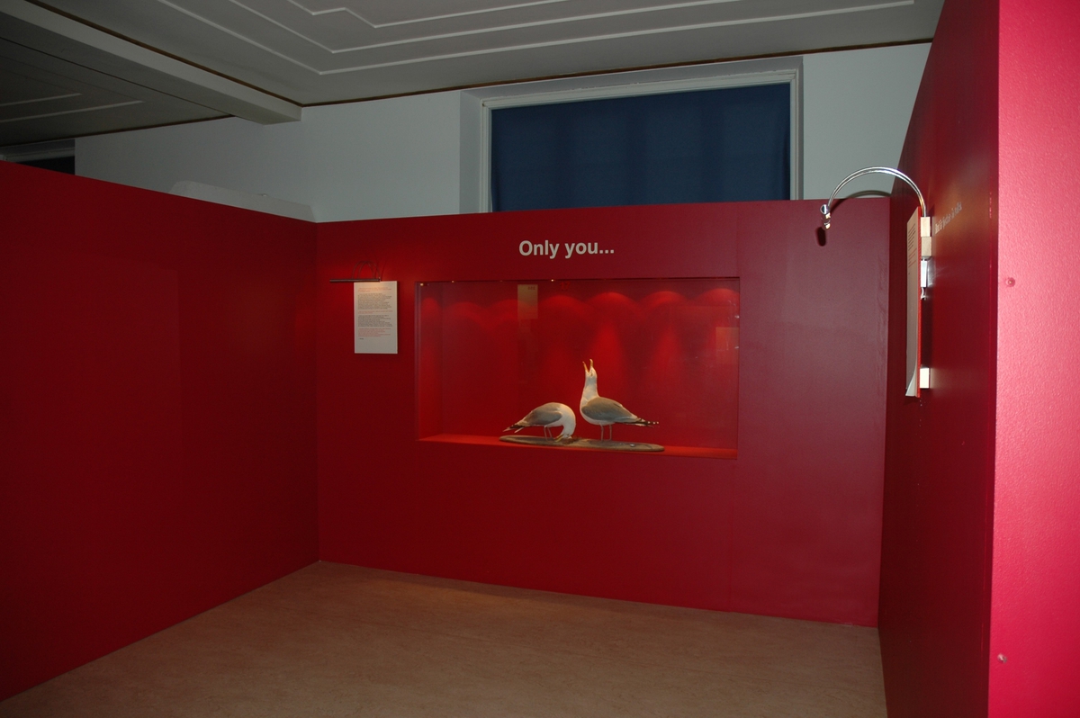 'Del av utställningen ''I love U'', monterad mås i en monter med texten ''Only U''. :: :: Ingår i serie med fotonr. 7099 med bilder på ''I love U''-utställningen.'