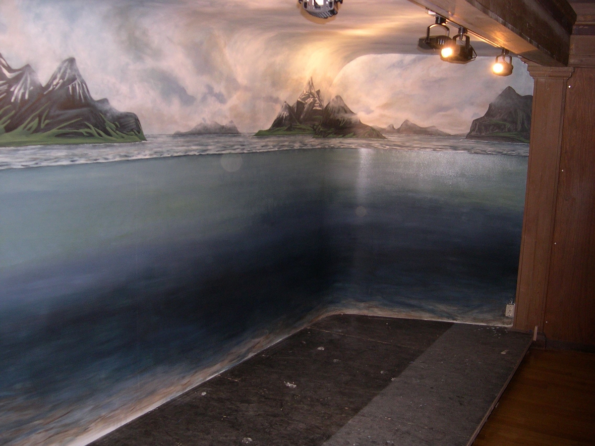 'Bakgrundsmålningen i sjökomontern, utförd av Ingrid Midsem. :: :: Bilder från arbetet med att konstruera en modell av Stellers sjöko utifrån beskrivning gjord av Georg Wilhelm Steller 1742. :: :: Modellen föreställer en ung hona som är nästan 5 meter lång och står utställd längst in i valsalen på Göteborgs Naturhistoriska Museum (2008-0124). :: :: Ingår i serie med fotonr. 7101:1-35.'