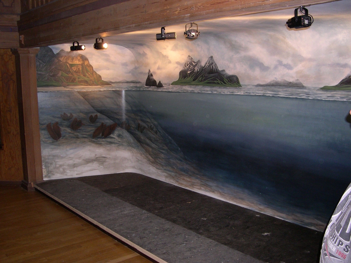 'Bakgrundsmålningen i sjökomontern, utförd av Ingrid Midsem. :: :: Bilder från arbetet med att konstruera en modell av Stellers sjöko utifrån beskrivning gjord av Georg Wilhelm Steller 1742. :: :: Modellen föreställer en ung hona som är nästan 5 meter lång och står utställd längst in i valsalen på Göteborgs Naturhistoriska Museum (2008-0124). :: :: Ingår i serie med fotonr. 7101:1-35.'