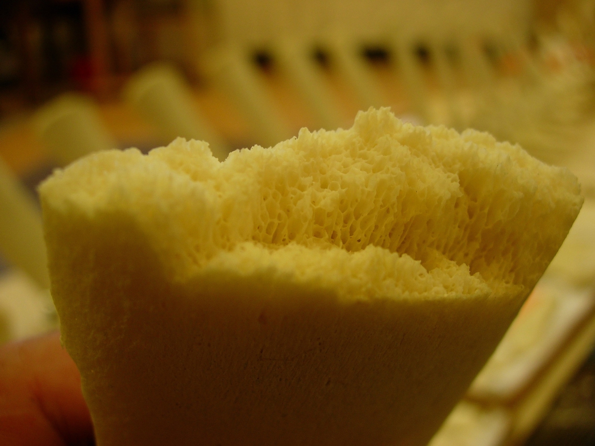 'Monteringsarbetet med näbbvalen, hane, Valders skelett. :: Närbild på porerna i avbruten skelettbit. :: :: Skelettet till näbbvalen är monterat och hänger i valsalen på Göteborgs Naturhistoriska Museum. Då näbbvalen sågs utmed kusten kom den att kallas Valder i media. :: :: Ingår i serie med fotonr. 7106 med bilder på näbbvalen som levande och under arbetet med att montera skelettet.'